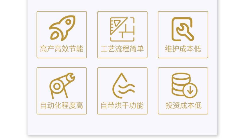 優(yōu)勢特點(diǎn):、高產(chǎn)高效節(jié)能、工藝流程簡單、維護(hù)成本低、自動(dòng)化程度高、自帶烘干功能、綜合投資成本低